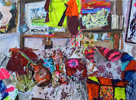 I had to disappear all my clothes to prove my studio at the Junkyard was light industrial usage, or something, so all I have hanging for a moment are a few flouro workshirts, which happen to match a couple of the UV pigments I've been mucking round with. I'm not sure who'll be on the sofa yet